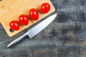 Warzywne krojenie ogórków i pomidorów na talerzu na drewnianym tle.Widok z góry.