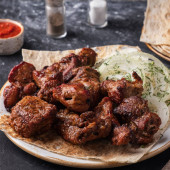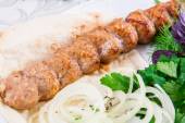 Smażony kebab z surową cebulą na talerzu. Zielenina i chleb pita. Pyszne kawałki mięsa z krągłymi cebulkami.