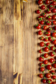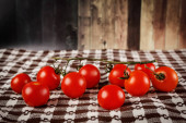 Pomidory wiśniowe na winorośli. Drewniane tło z miejscem na tekst
