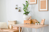 Półka z książkami i roślinami w pobliżu ściany świetlnej