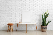 Klatka piersiowa z szufladami i półkami z wystrojem w pobliżu ściany z cegły