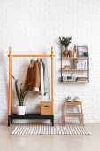 Klatka piersiowa z szufladami i półkami z wystrojem w pobliżu ściany z cegły