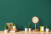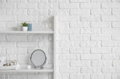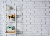 Nowoczesne półki z wystrojem i lampą przy ścianie z cegły