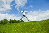 szczęśliwy młody człowiek - skoki koniec leci w błękitne niebo