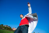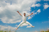 Zdjęcie "szczęśliwy młody człowiek - skoki koniec leci w błękitne niebo" może być wykorzystywane do celów osobistych i komercyjnych zgodnie z warunkami zakupionej licencji Royalty-free. Obraz jest dostępny do pobrania w jakości wysokiej rozdzielczości do 5760x3840.