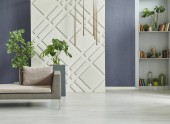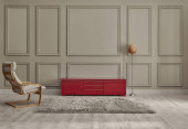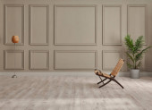Dekoracyjny pokój dzienny, urządzenie telewizyjne z ramą w stylu plakatu, dywan krzesło i lampa projekt, brązowy tło ściany.