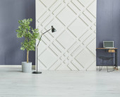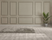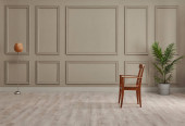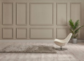Klasyczne brązowe tło ścienne, pomieszczenie wewnętrzne, dywan w stylu krzesełkowym, wazon detali roślinnych.