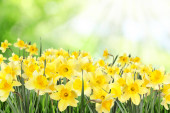 Piękne kwitnące żółte żonkile na zewnątrz w słoneczny dzień