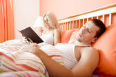 uśmiechnięta młoda para leży w łóżku i wykorzystania komputera typu tablet
