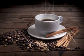 Kubek kawy i spodek na drewnianym stole. Ciemne tło.
