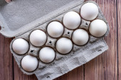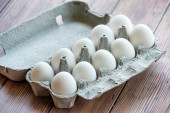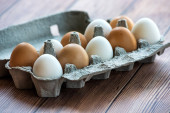 Zdjęcie "Pudełko z jajkami w kolorze brązowo-białym na drewnianym stole. Mieszane jaja w pudełku - Top View" może być wykorzystywane do celów osobistych i komercyjnych zgodnie z warunkami zakupionej licencji Royalty-free. Obraz jest dostępny do pobrania w jakości wysokiej rozdzielczości do 5760x3840.