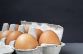 Pudełko z jajkami w kolorze brązowo-białym na drewnianym stole. Mieszane jaja w pudełku - Top View