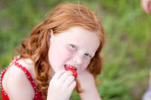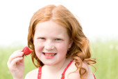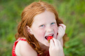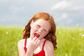 dziewczyna, która zjada truskawka. nieostrość. skupić się na oko.