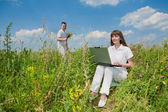 szczęśliwa para na laptopa na zewnątrz. położył się na zielonej trawie.