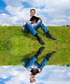 dorywczo szczęśliwa para na laptopa na zewnątrz. położył się na zielonej trawie.