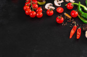 widok z góry czarny niegotowane spaghetti z przyprawami i ziołami na czarnym tle. widok z góry.