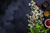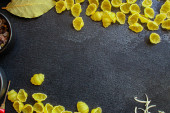 widok z góry surowego makaronu niegotowanego na czarnym tle