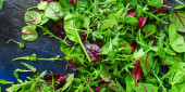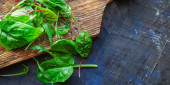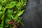 widok z góry świeżej zieleni, bazylii, rukoli, liści, ziół i przypraw