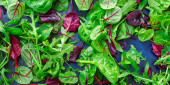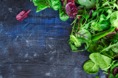 widok z góry świeżej zieleni, bazylii, rukoli, liści, ziół i przypraw