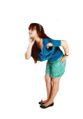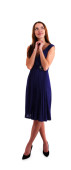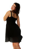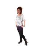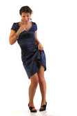 młode piękne dziewczyny w szarej sukience ręce na kolanach i patrząc w kamerę, stojący studio tło białe.