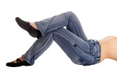 młoda kobieta siedzi na krok drabiny w szarym sukienka spodnie i czarny sweter, shooing jej fantastyczne ciało.