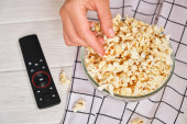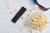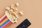 wiadro popcornu, telewizor na beżowym tle. Koncepcja czasu wolnego i rozrywki. Widok z góry
