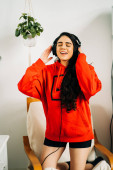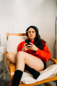 szczęśliwa młoda kobieta korzystająca z elektronicznego urządzenia słuchającego muzyki