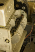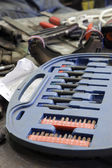 Spawarka elektryczna, urządzenia spawalnicze, na stole, maska spawalnicza, różne narzędzia ręczne są rozłożone wokół.