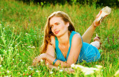 młoda dziewczyna siedzi na zielonej trawie przeciw błękitne niebo