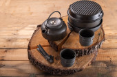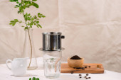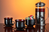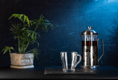 Kompozycja herbaty na ciemnym tle i zielony doniczka. Opaska na podwieczorek w niskiej tonacji. Palma w tle.