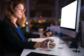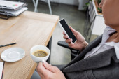 Poważna młoda przedsiębiorczyni pijąca kawę i sprawdzająca media społecznościowe na smartfonie