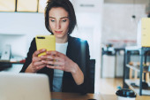 Zdjęcie "Poważna młoda przedsiębiorczyni pijąca kawę i sprawdzająca media społecznościowe na smartfonie" może być wykorzystywane do celów osobistych i komercyjnych zgodnie z warunkami zakupionej licencji Royalty-free. Obraz jest dostępny do pobrania w jakości wysokiej rozdzielczości do 5760x3840.