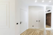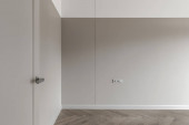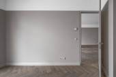 Zdjęcie "Simple Modern Grey Drzwi zamknięte z ramą na szarej ścianie z szarym wyłącznikiem światła i szarym gniazdkiem w pustym pokoju. Wnętrze Element współczesnego wystroju wnętrz w nowoczesnym domu" może być wykorzystywane do celów osobistych i komercyjnych zgodnie z warunkami zakupionej licencji Royalty-free. Obraz jest dostępny do pobrania w jakości wysokiej rozdzielczości do 5760x3840.