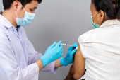 Kampania szczepień przeciw covid-19 (koronawirusowi) w klinice - osoby szczepione przez lekarza i pielęgniarkę w celu zapobieżenia wystąpieniu ogniska wirusa korony w miejscu szczepienia