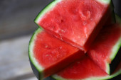 Kawałki melona i arbuza na drewnianej powierzchni.