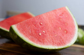Kawałki melona i arbuza na drewnianej powierzchni.