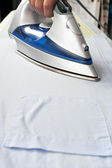 Mężczyzna prasowanie czystej koszuli w domu, zbliżenie