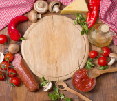 Składniki pizzy na ciemnym tle i okrągłą deskę do cięcia, wolne miejsce na tekst. Pepperoni, mozzarella, pomidory, oliwki, grzyby i mąka są różne produkty do produkcji pizzy i makaronu