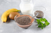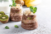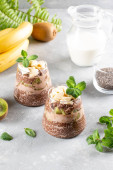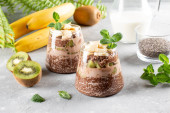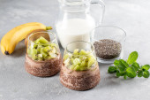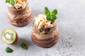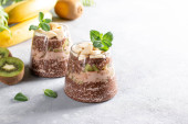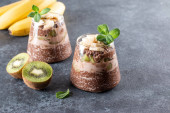 Wegański deser, chia pudding z kiwi i bananem na szarym stole. Superjedzenie. Zdrowa żywność.