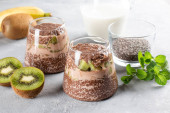 Zdjęcie "Wegański deser, chia pudding z kiwi i bananem na szarym stole. Superjedzenie. Zdrowa żywność." może być wykorzystywane do celów osobistych i komercyjnych zgodnie z warunkami zakupionej licencji Royalty-free. Obraz jest dostępny do pobrania w jakości wysokiej rozdzielczości do 5760x3840.