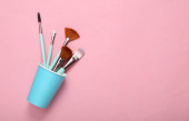 Szczotki do makijażu w białym kubku na niebieskim tle