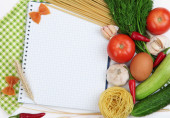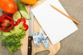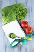 sztućce związany z pomiaru taśmę i notebook z warzyw na drewniane tła