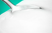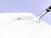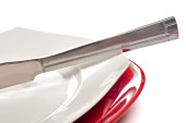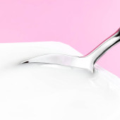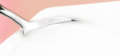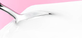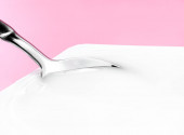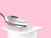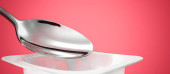 Kubek jogurtowy i srebrna łyżka na czerwonym tle, biały plastikowy pojemnik z jogurtem, świeży nabiał dla zdrowej diety i równowagi żywieniowej