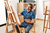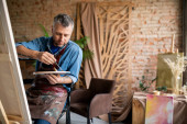 Poważny młody montaż mebli specjalista w odzieży roboczej mocowania części krzesła podczas montażu go w dużym nowym domu, mieszkaniu lub studio