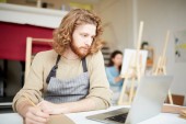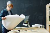 Współczesny specjalista od montażu mebli w odzieży roboczej siedzącej na podłodze i mocującej części drewnianego krzesła do rodziny z pudełkami