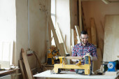 Zdjęcie "Poważny młody specjalista od montażu mebli w odzieży roboczej stojącej na kolanach na podłodze i montującej drewniane krzesło w nowym mieszkaniu lub studio" może być wykorzystywane do celów osobistych i komercyjnych zgodnie z warunkami zakupionej licencji Royalty-free. Obraz jest dostępny do pobrania w jakości wysokiej rozdzielczości do 5760x3840.