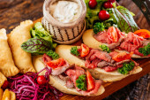 Zdjęcie "różnorodne przekąski. menu. widok z góry." może być wykorzystywane do celów osobistych i komercyjnych zgodnie z warunkami zakupionej licencji Royalty-free. Obraz jest dostępny do pobrania w jakości wysokiej rozdzielczości do 5760x3840.