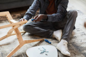 Młody specjalista od montażu mebli stojący na kolanach na podłodze i montujący nowe drewniane krzesło wewnątrz studia, domu lub mieszkania