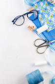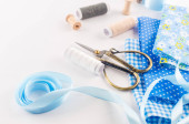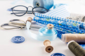 Zestaw niebieskich nici do szycia tkanin, guzików i akcesoriów na białym tle. Kompozycja płaska z innymi wyrobami do szycia.