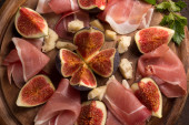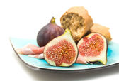 świeże figi; szynka na małe okrągłe deska do krojenia na czarny